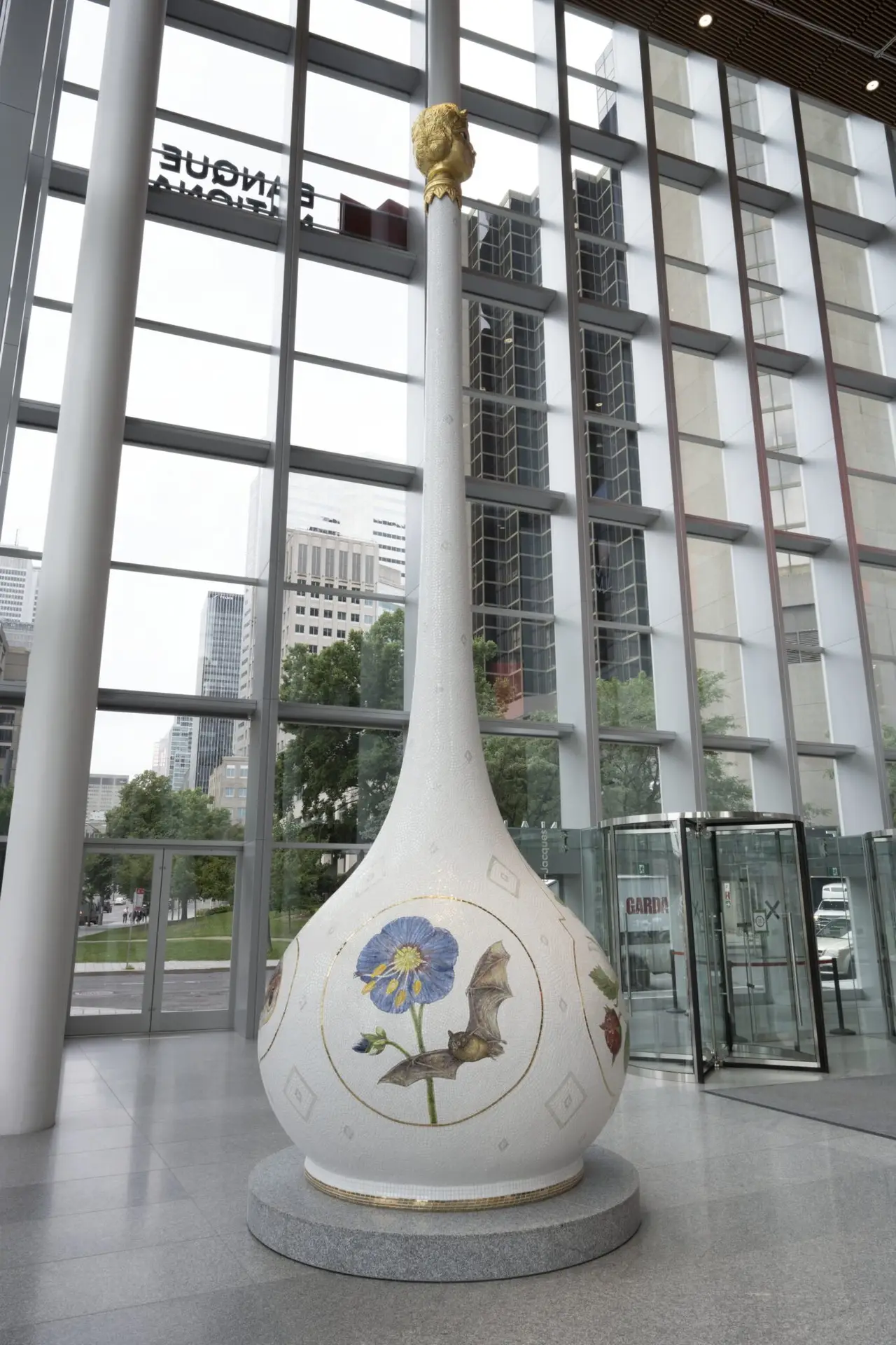 Scentime, se veut un jeu de mots sur le parfum et la plus petite devise de l’ancienne France. La sculpture représente un flacon de parfum de 26 pieds de haut, revêtu de céramique et de